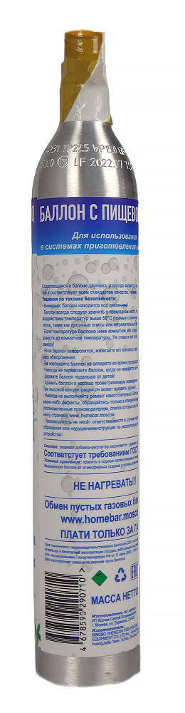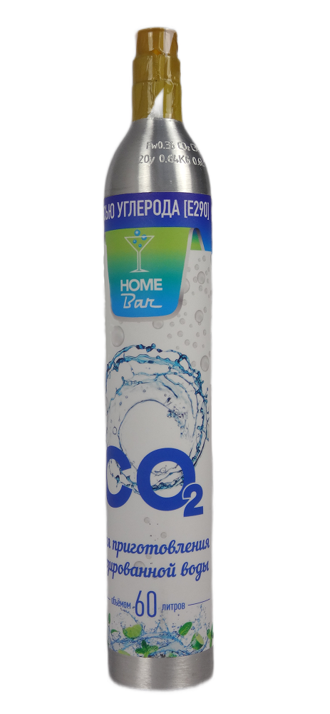 Диаметр баллона 60 мм, высота 370 мм.Газа 425 грамм.Баллона хватает на газирование 60 литров воды.
