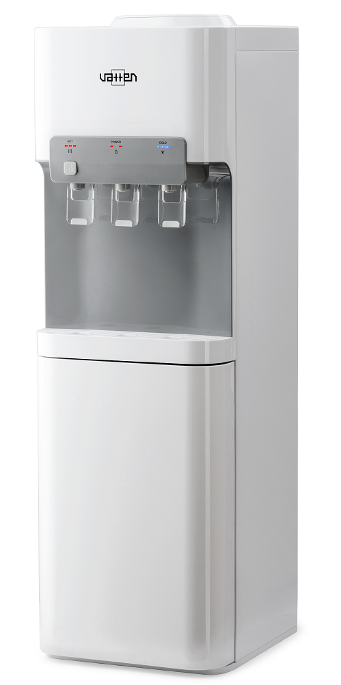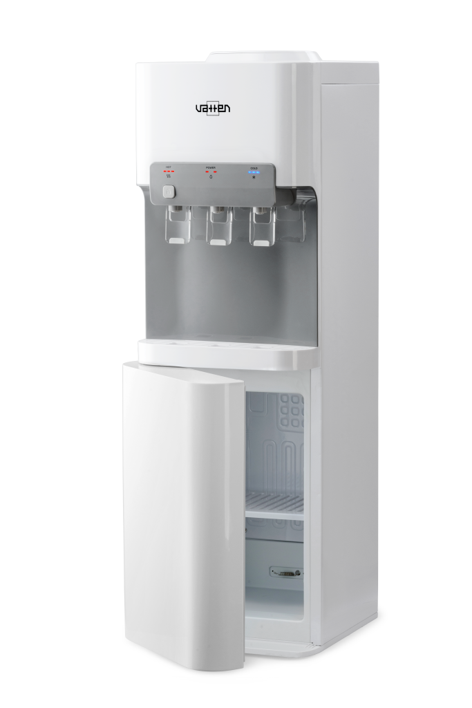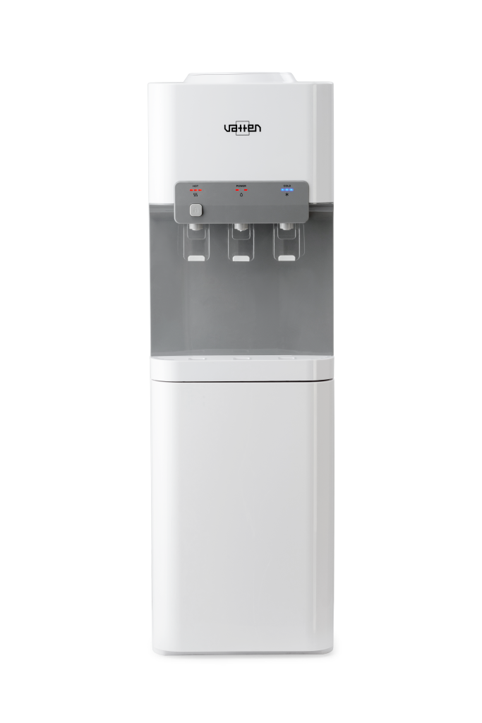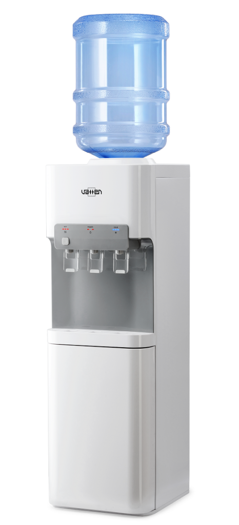 Данный кулер V11WKB компрессорный, с верхним расположением бутыли. Три пушкрана для горячей, холодной, и для воды комнатной температуры. Есть блокировка крана горячей воды (защита от детей). Есть холодильник.