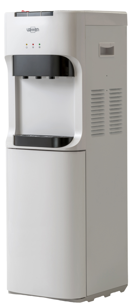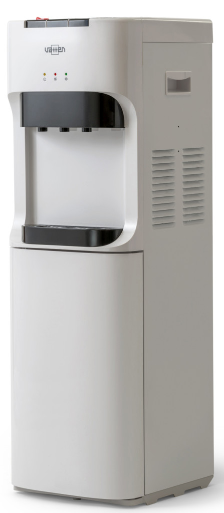 Классический кулер с нижней загрузкой бутыли. Цвет корпуса белый. Боковые панели металлические. Три крана, управление разливом воды при помощи трёх кнопок (горячая, холодная и вода комнатной температуры). Бак горячей воды из нержавеющей стали. Кран горячей воды имеет "защиту от детей". Три LED индикатора (включение питания, индикатор нагрева, индикатор охлаждения). Пригоден для эксплуатации в очень жарком климате - температура эксплуатации кулера от 10 до 38 градусов Цельсия. Посмотреть статьи о том как выбрать кулер.