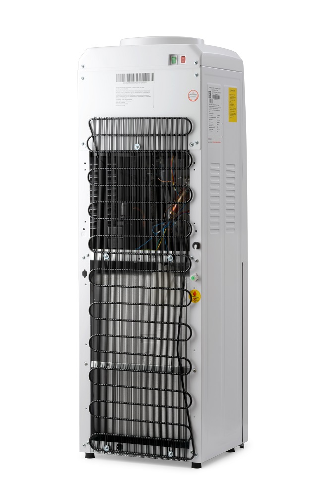 Классический напольный кулер с верхней загрузкой бутыли и холодильником. Компрессорное охлаждение и есть отдельно нагрев. Устройство подает воду горячей, холодной температуры. Разлив воды осуществляется нажатием на рычаг крана кружкой. Преимущества для офиса: Наличие компрессора позволяет охлаждать воду до 5 градусов Цельсия, что актуально для обеспечения сотрудников питьевой водой разной температуры в зависимости от сезона. Оснащен холодильной камерой (минибаром) на 12 литров - в ней можно хранить бутерброды и напитки.