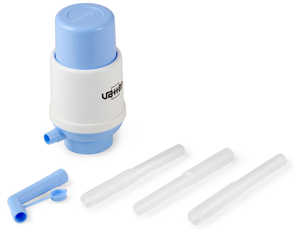 Механическая помпа для разлива воды. Подходит к бутылям объёмом 19 литров. Для фиксации помпы на горлышке бутыли следует с некоторым небольшим усилием просто одеть ее на горлышко бутыли, и опустить ее с легким усилием вниз до упора. При необходимости поправить до вертикального положения.