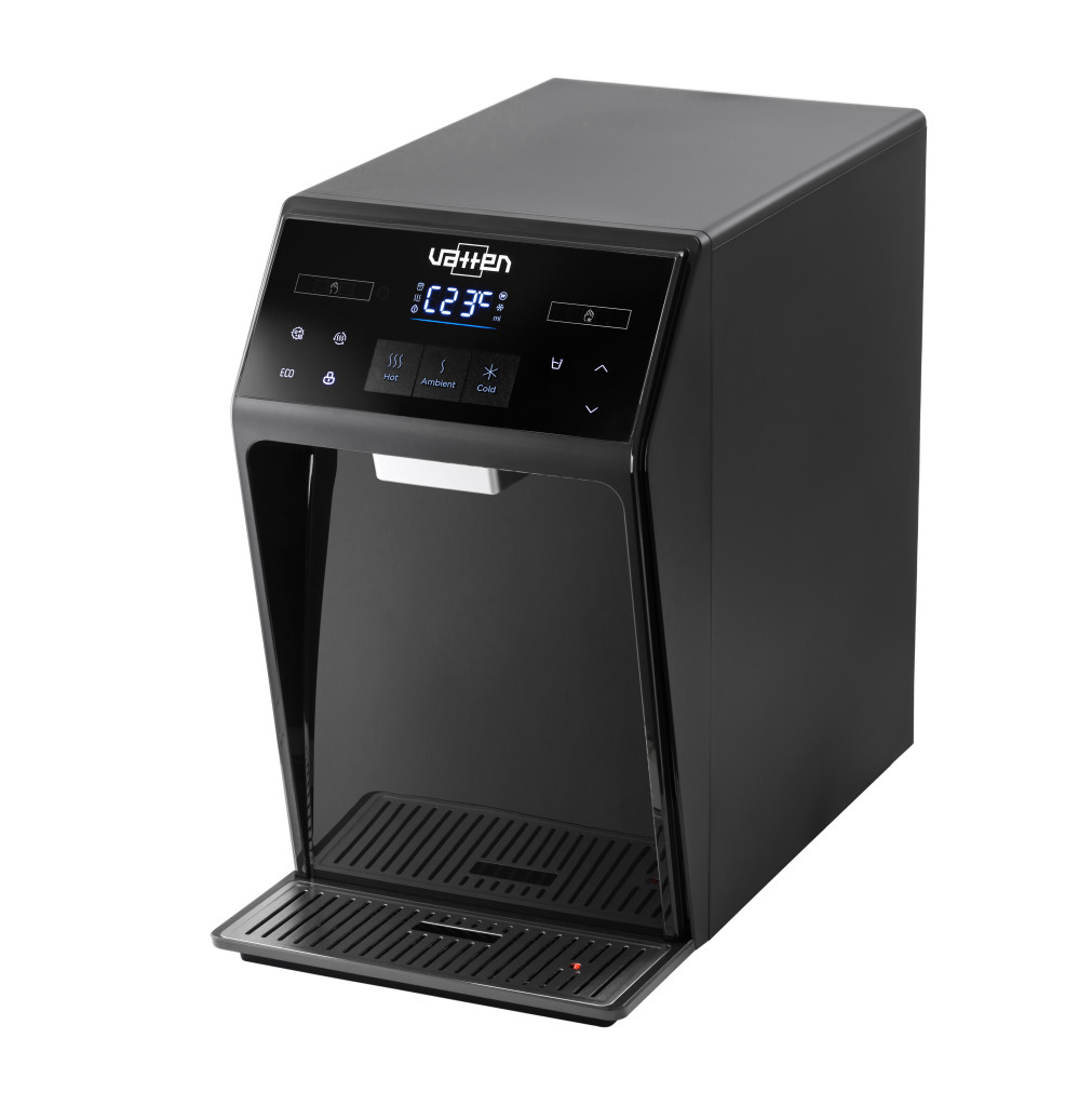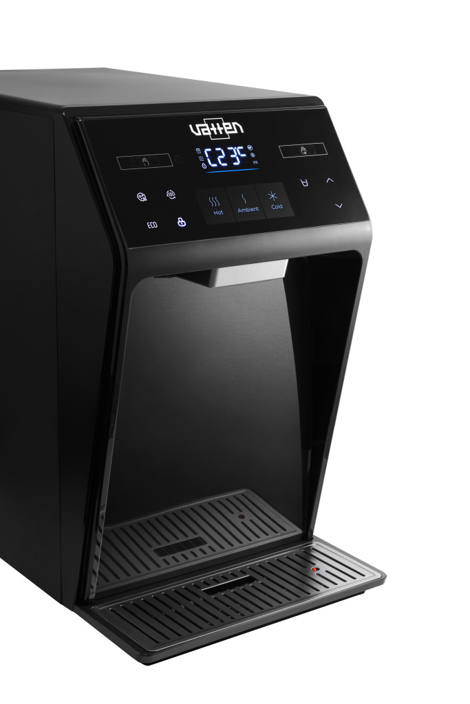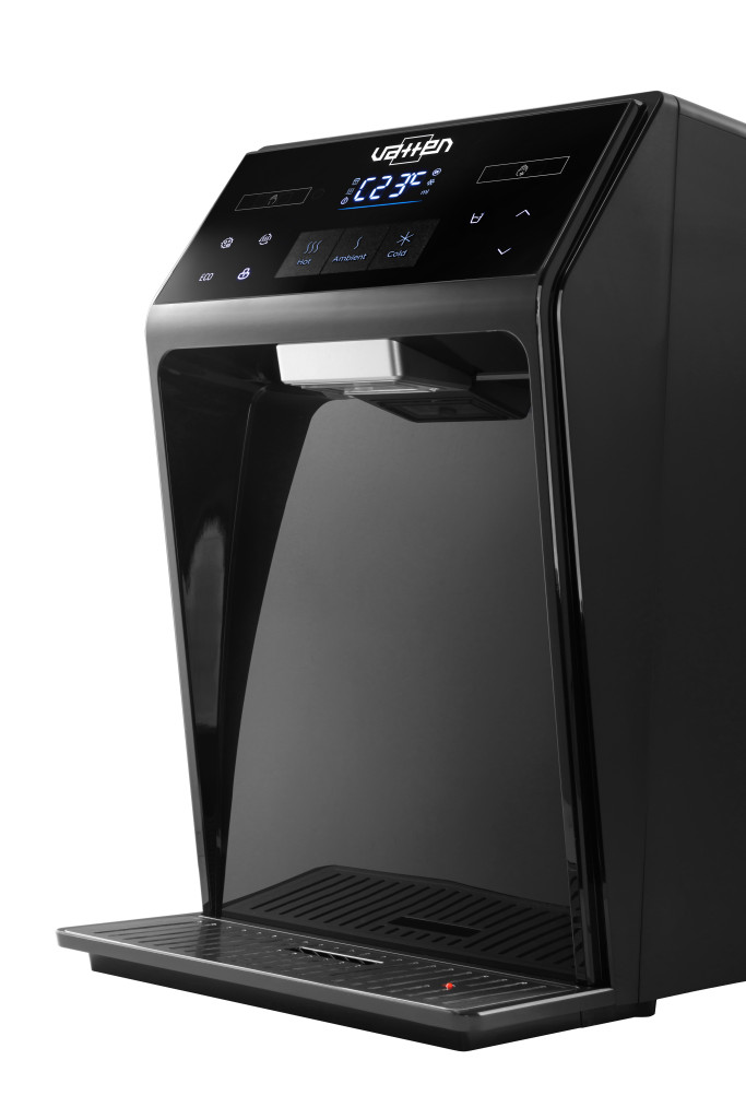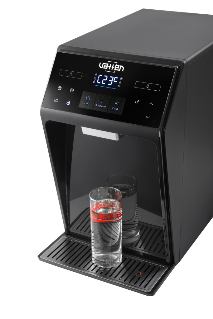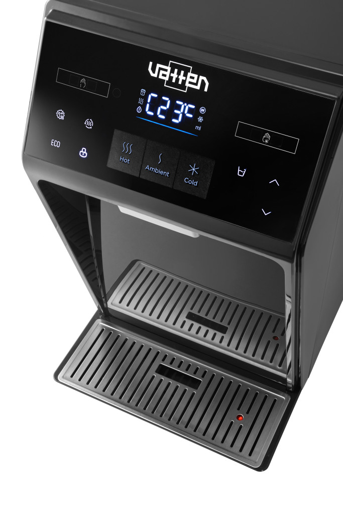 Новейший компактный настольный проточный кулер-пурифайер VATTEN FD904NKVT с нагревом и тихим компрессорным охлаждением воды. Очищает водопроводную воду при помощи системы UF-фильтрации (БЕЗ УМЯГЧЕНИЯ ВОДОПРАВОДНОЙ ВОДЫ). Также аппарат имеет встроенную ультрафиолетовую лампу для обеззараживания воды. Все возможные бактерии и микробы под воздействием УФ-лампы гарантированно погибают. Высокая производительность позволяет разместить его не только дома, но и в небольшом офисе, и обеспечить питьевой режим 20 пользователям. А компактные размеры и привлекательный внешний вид позволяют с легкостью вписать пурифайер в любую мебель на кухне, или в другом помещении. Управление всеми функциями пурифайера – сенсорное.В устройстве также присутствует функция подачи воды без касания для комнатной и холодной воды ( для горячей воды эта функция недоступна). Самые верхние кнопки слева и справа. Настройка по инструкции.