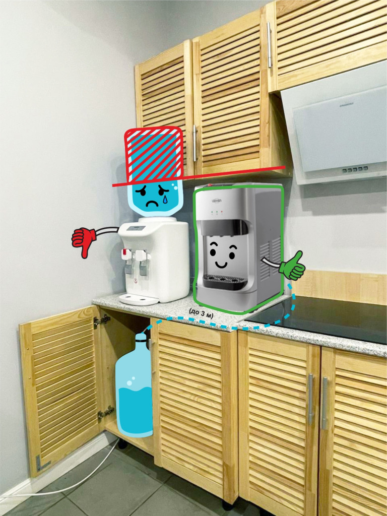 Более того, поскольку бутыль с водой не нужно устанавливать на кулер, то только настольные кулеры с выносной бутылью могут быть использованы на кухне для установки на столе под навесными шкафами.
