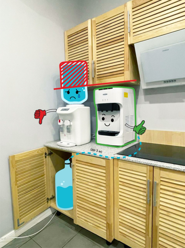 Более того, поскольку бутыль с водой не нужно устанавливать на кулер, то только настольные кулеры с выносной бутылью могут быть использованы на кухне для установки на столе под навесными шкафами.