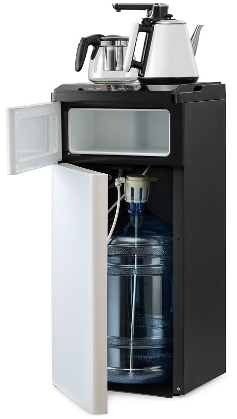 Техническая новинка кулера с нижней загрузкой бутыли. Кулер с чайным столиком. Подача воды осуществляется через кран, установленный в верхней части аппарата.