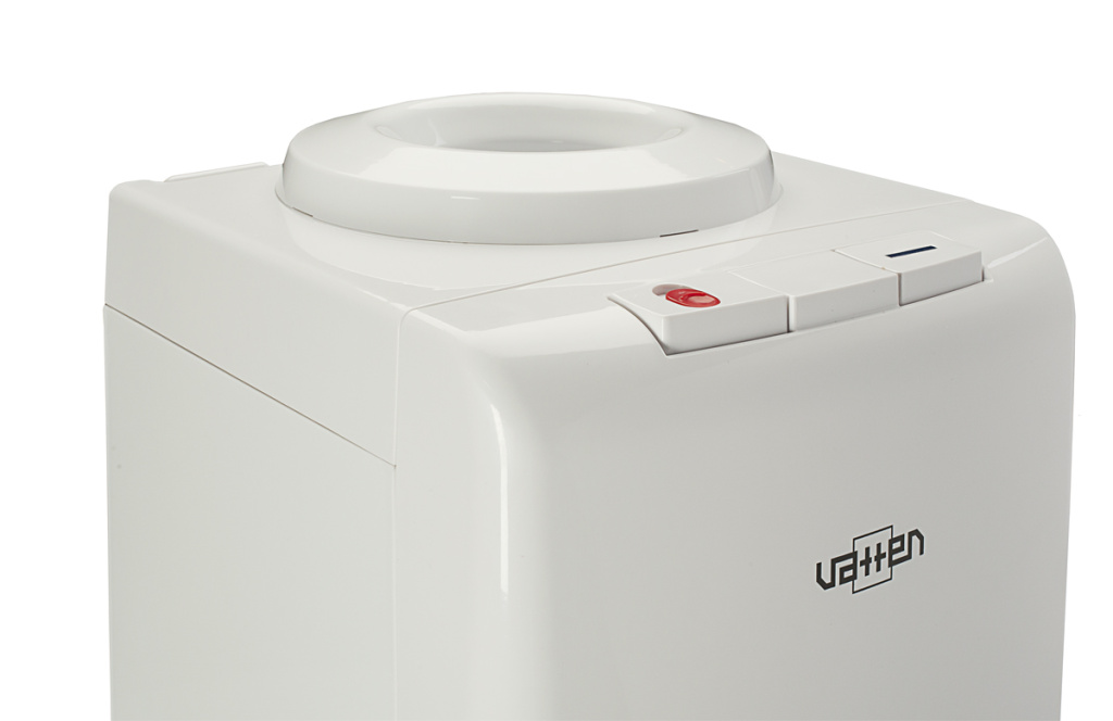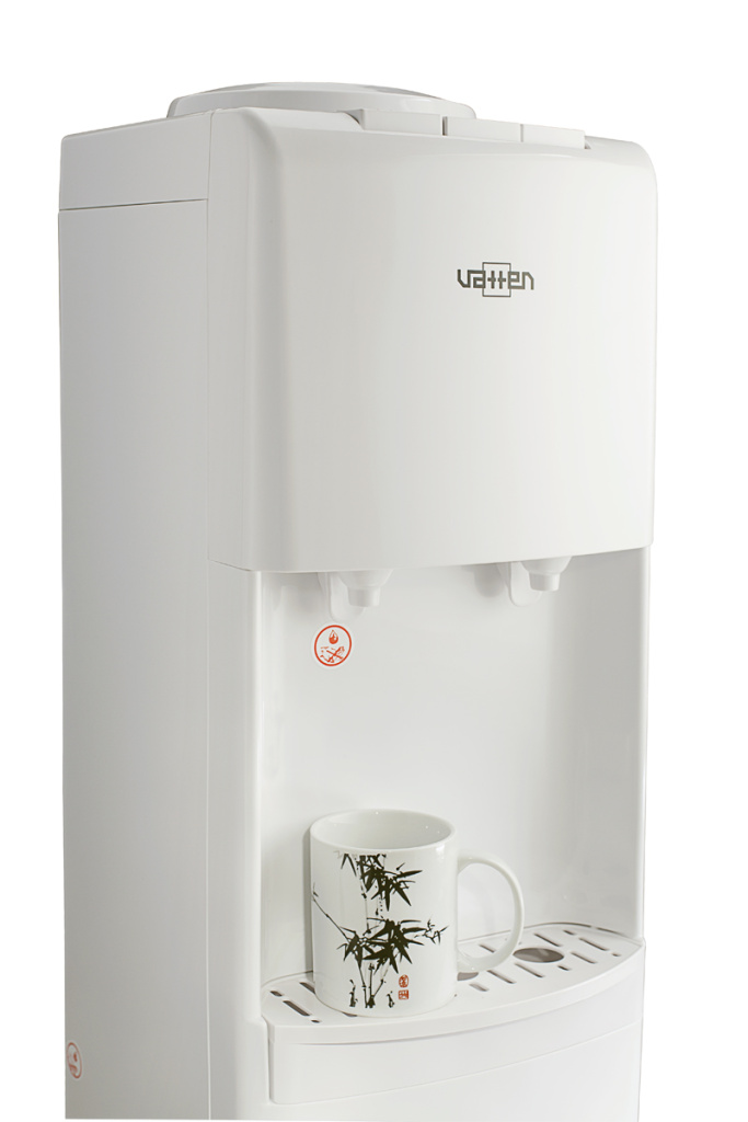 Стандартный напольный компрессорный кулер для воды бюджетного уровня. Без шкафчика. Для дома. Для офиса. Современный дизайн. Цвет корпуса белый, все панели изготовлены из качественного, устойчивого к ультрафиолету пластика. Два крана, управление кнопками - горячая и холодная вода. Кран горячей воды имеет "защиту от детей". Пригоден для эксплуатации в очень жарком климате - температура эксплуатации кулера от 10 до 38 градусов Цельсия.